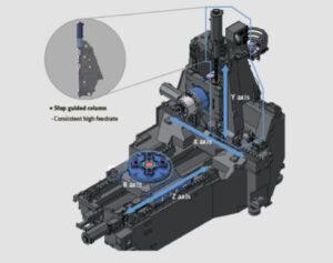 - Швидка подача по осях XYZ 60 м/хв з прискоренням/уповільненням більше 1G по осях Y та Z. Висока жорсткість і точність для кращої якості оброблюваної поверхні досягається завдяки великим роликовим лінійним напрямним.